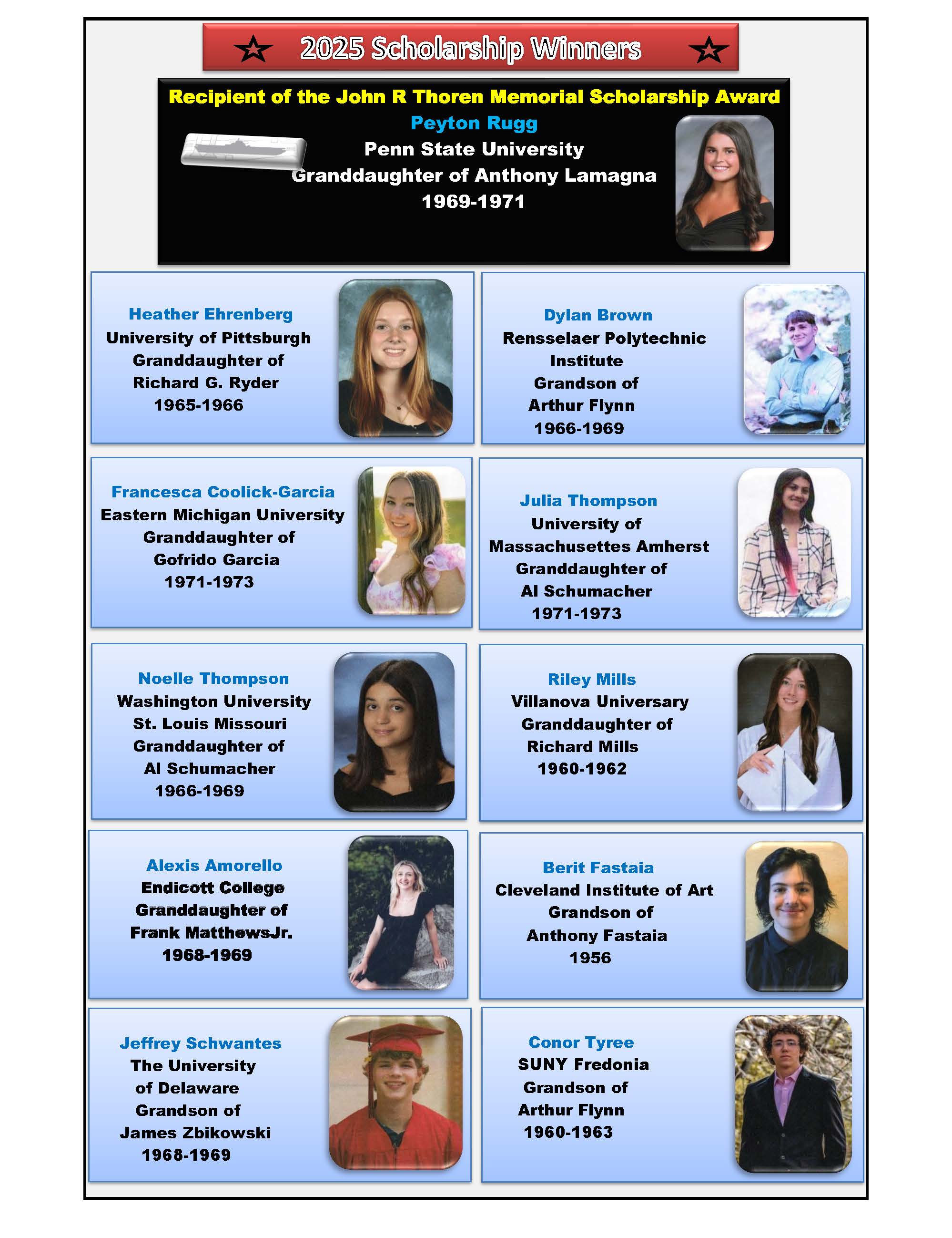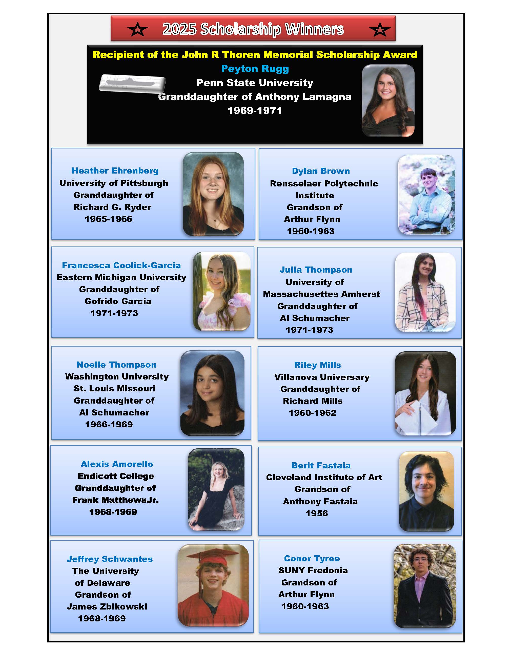 We are proud to present to you our group of scholarship winners for the 2025 school year. The USS Intrepid Former Crew Members Association Scholarship Program is one of our outstanding programs which recognizes and rewards those grandchildren of our Former Crew Members for academic excellence.  Our Scholarship Chairman, Harris Seorti, has once again performed the admirable task of making sure that those selected high school student scholarship winners are recognized for their achievements.  Well done Students. students!